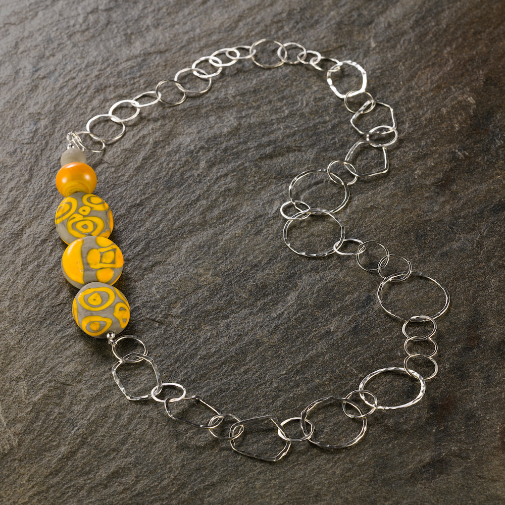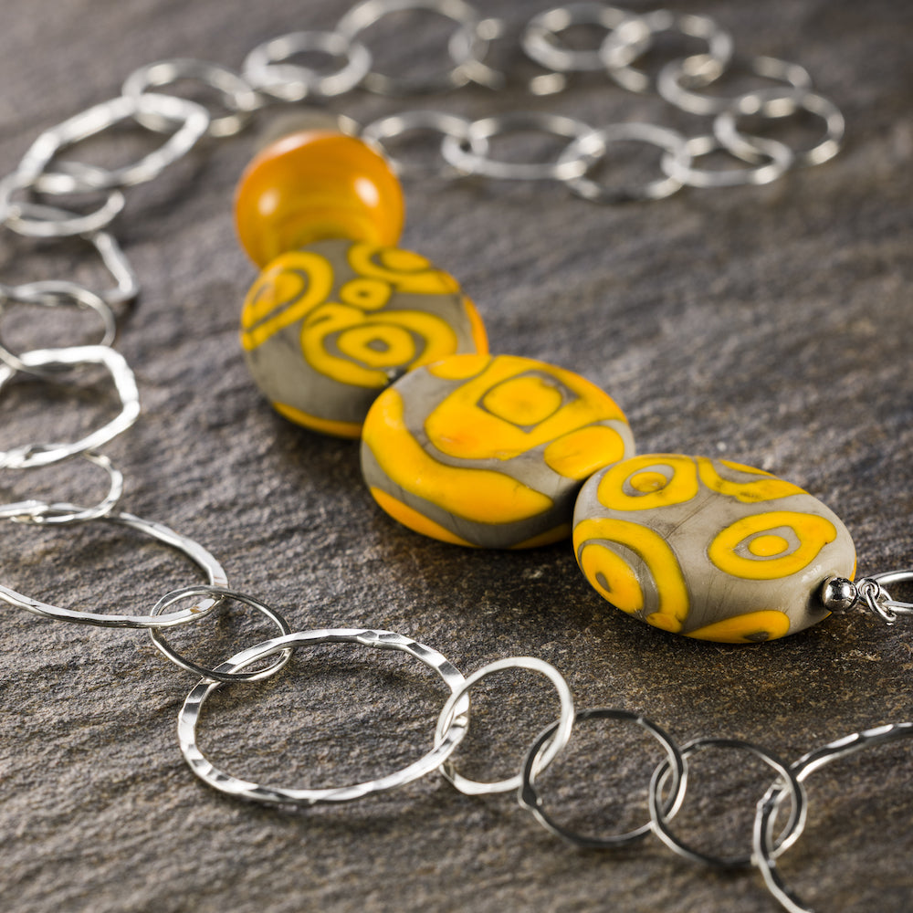 Su questa struttura viva e materica si innestano perle di vetro di Murano nelle tonalità grigio fumo e senape: colori intensi, terrosi, evocativi. Ogni perla è modellata artigianalmente, con sfumature uniche che dialogano con l’argento in un equilibrio perfetto tra eleganza e carattere.