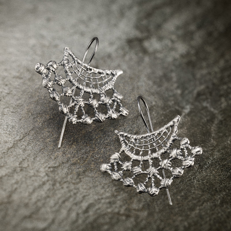 Ogni orecchino è realizzato a partire da vero pizzo artigianale, trasformato in metallo prezioso grazie alla tecnica della fusione a cera persa. Il risultato è un gioiello che conserva tutta la delicatezza del tessuto originale, reso eterno in argento.