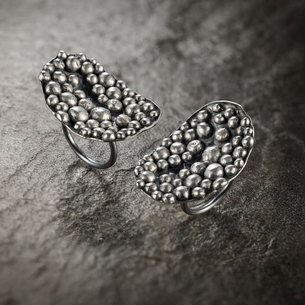 L’anello Bolle prende forma attraverso le tecniche dell’oreficeria classica, dove ogni piccola sfera viene modellata, saldata e rifinita a mano. Un processo lento e meditativo, in cui il metallo viene costruito passo dopo passo per ricreare un paesaggio di volumi morbidi e irregolari, come se l’argento fosse rimasto sospeso nell’istante esatto in cui sta per diventare movimento.