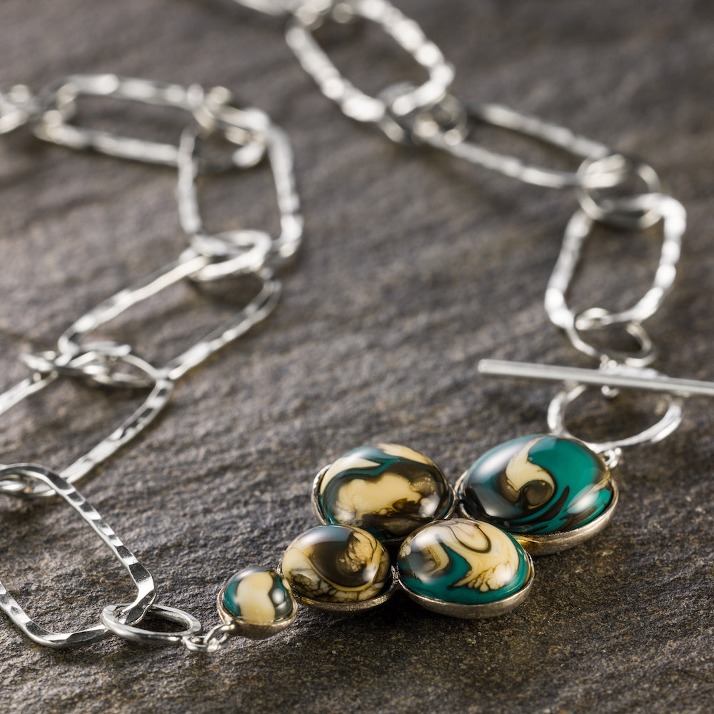Cruz nasce dall’incontro tra linee essenziali e dettagli preziosi: la forza geometrica dei rettangoli in argento, la leggerezza trasparente delle gocce di vetro di Murano, il contrasto delicato dei colori verde e avorio. È una collana che parla di spiritualità, di eleganza minima, di gesti antichi reinterpretati con maestria artigianale.