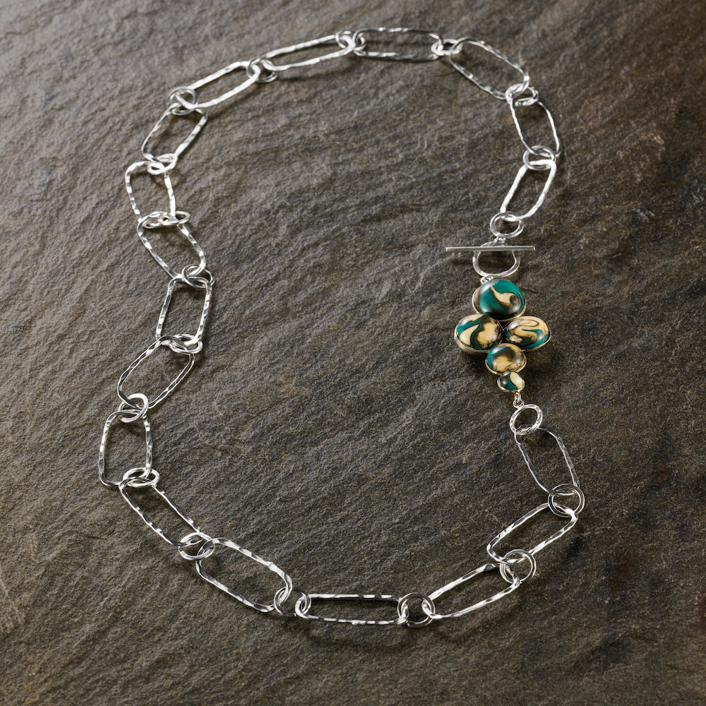 Sospese lungo la catena, gocce di vetro di Murano verde e avorio modellate a mano a forma di croce aggiungono un tocco di poesia e colore, dialogando con l’argento in un equilibrio perfetto tra spiritualità e modernità. Ogni goccia è unica, portatrice di luce e trasparenza, evocando gesti e tradizioni che attraversano il tempo.