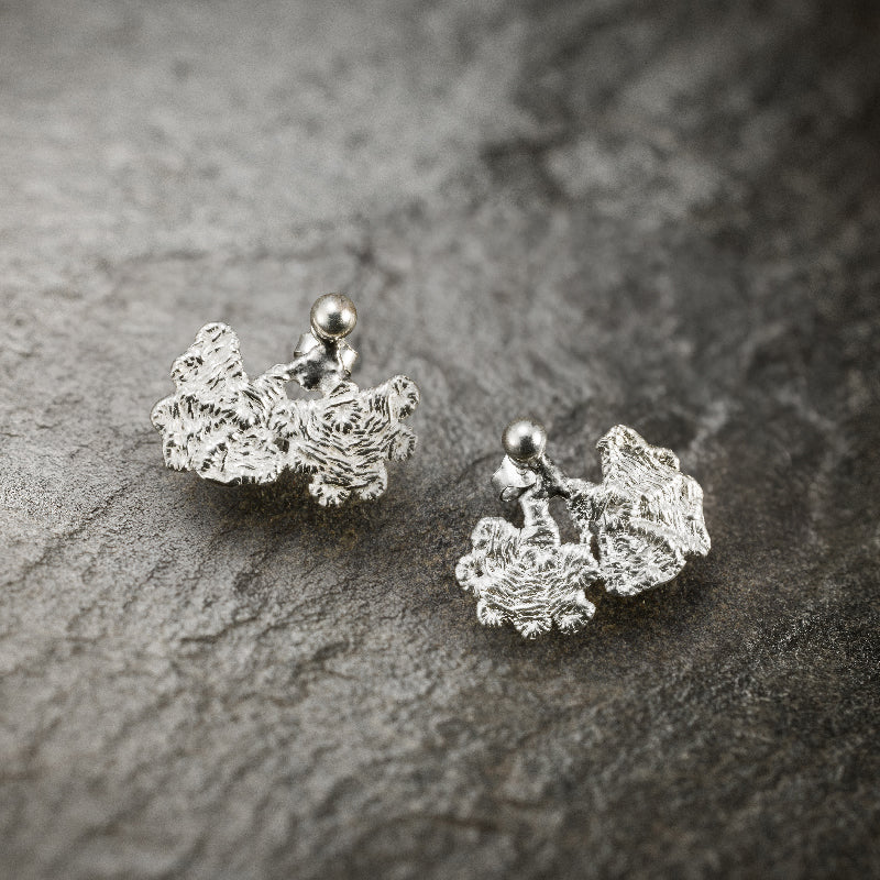 Gli orecchini Double Flower nascono dal gesto delicato di un filo di pizzo trasformato in argento vivo. Realizzati con la tecnica della cera persa, custodiscono la memoria del tessuto originale, che diventa forma preziosa e resistente. Due piccoli fiori intrecciati raccontano la grazia del movimento naturale, il dialogo tra fragilità e forza.