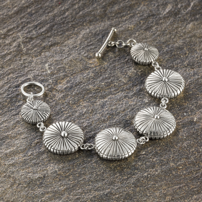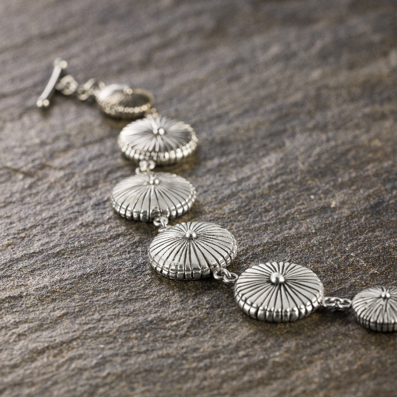 Il bracciale SunnyRain nasce dal gesto lento della scultura in cera, dove ogni elemento prende forma come una piccola goccia di luce. I dischi d’argento 925, modellati a mano, evocano la danza del sole e della pioggia: superfici che catturano i riflessi, alternando pieni e vuoti, chiaroscuri e bagliori.