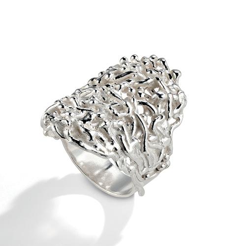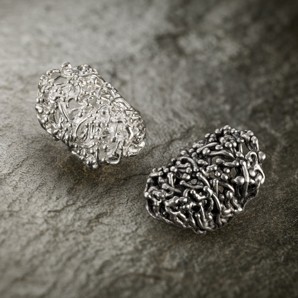 Scolpito a mano sulla cera e poi fuso in Argento 925 tramite la tecnica della cera persa, l’anello Tricoma è una scultura organica che si forma come una crescita naturale. Ogni nodo, curva e intreccio è modellato uno per uno, rendendo ogni pezzo irripetibile, come un frammento di natura tradotto in metallo.